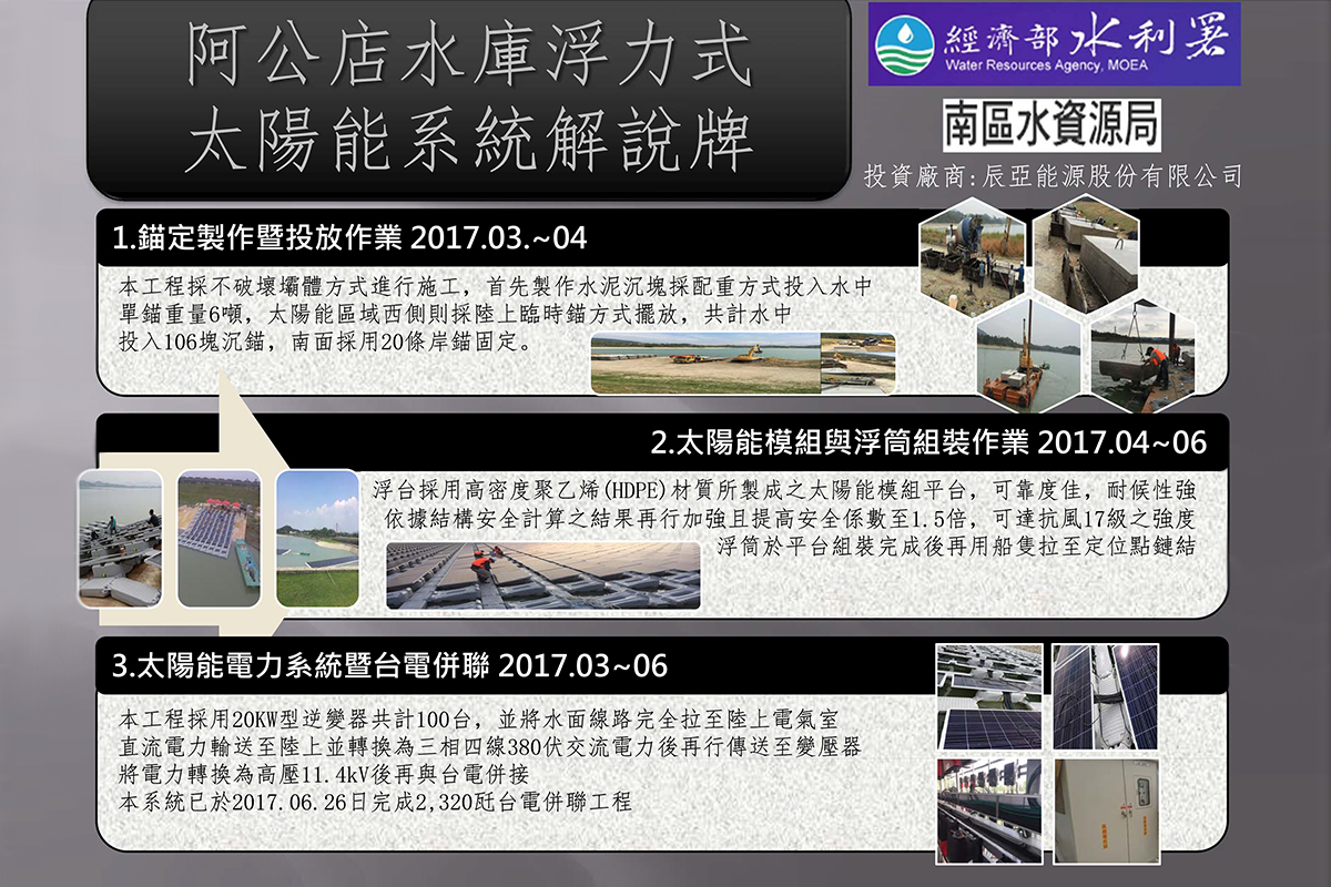 全台首座MW等級水上型電站,座落於高雄市燕巢區南部水資源管理中心阿公店水庫,第一期總容量2.32MW